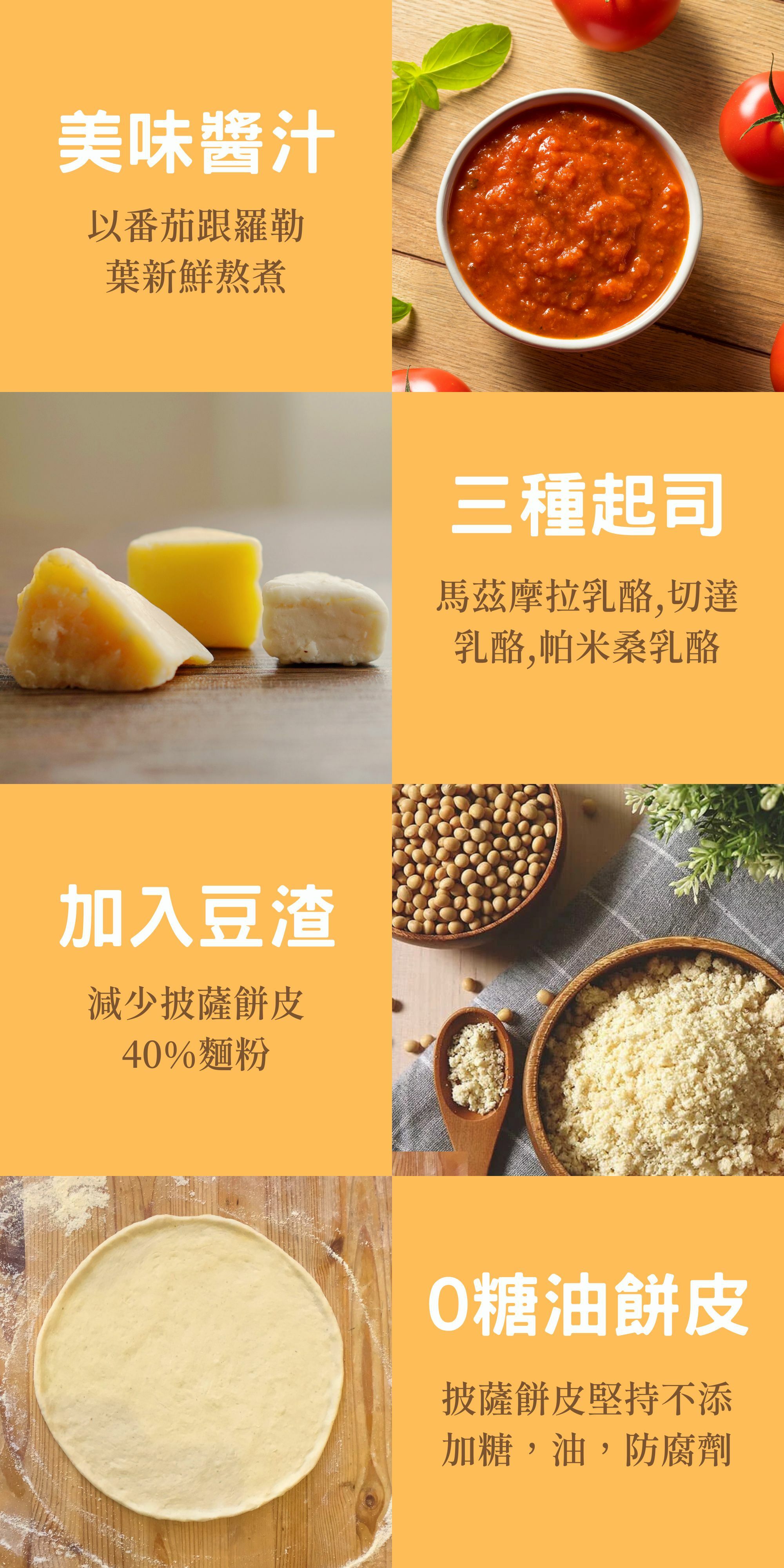 ● 成  分:小麥麵粉、乳酪絲 (馬茲摩拉乳酪,切達乳酪,帕米桑乳酪,牛乳,乳酸菌,氯化鈣,鹽,植物性酵素)、水非基改黃豆渣、番茄醬 (番茄,洋蔥,糖,鹽,羅勒,奧勒岡,檸檬酸)、小麥蛋白、酵母鹽。