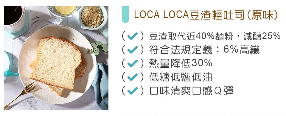 LOCA LOCA堅持「歐式麵包」的健康做法,採用 "低糖低油低鹽" 的方式來製作,成份單純:新鮮豆渣、加拿大紅春麥麵粉、酵母以及低量的糖鹽油,增添風味亦是使用健康滿點的果乾與穀物,不是為了追求數據而拒吃,而是要選擇對的「原生食物」來吃,才是最好的!我們也絕不添加色素、香精、防腐劑和酥油,讓你吃的更健康、更安心。